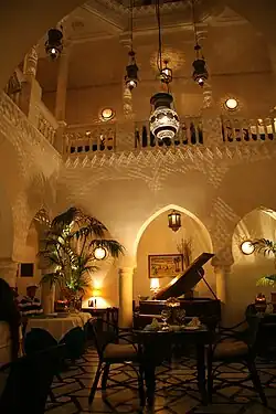 - 🌍 Rick's Cafe, 248 Rue Sour Jdid, ☏ +212 22 27 42 07, info@rickscafe.ma. This restaurant claims to have recreated the eponymous cafe from the movie Casablanca. Excellent location, within a 20-minute walk of the Hassan II Mosque and in the walls of the Old Medina bordering the ocean. The food is excellent, though expensive. Eat at one of the tables on the second floor for an excellent view of the seats below and the niveau-Moroccan decorations or eat on the ground floor to be nearer the piano player who plays, of course, "As Time Goes By" every night. Excellent selection of wine and liquor and, for Morocco, a thorough beer selection (5 different brands). The staff, in tuxedos and fezes, are superb. Dress code. Do not show up in shorts. dinner for 2 ~800 dirham..