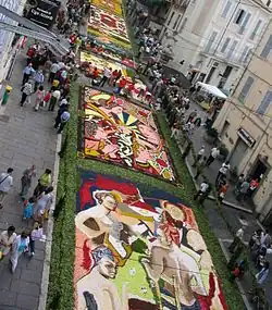 - π Genzano β An interesting town but mainly famous for its "Infiorata" on the Sunday and Monday following Corpus Christus. A whole street is covered with carpets of flowers and a masked parade walks on these, with participants in traditional clothes. Each year the flower designs must conform to a previously agreed theme.