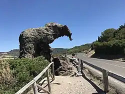 - 🌍 Roccia dell'elefante (Elephant Rock) (Multeddu locality). It is a rust-colored heavily eroded roughly 4m in height block of granite which is said to resemble a sitting elephant. Its resemblance with an elephant was first noted by the scholar Edoardo Benetti in 1914. Before that it was known as Sa Pedra Pertunta (perforated stone). This stone used to be a part of the rocky complex upstream Castellazzu from which it fallen downstream. The rock is not only popular among the modern tourists, apparently it was a place of cult since the prehistoric time: there are two domus de janas from pre-nuraghic time located there.