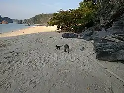Monkeys on Monkey IslandMonkey Island.Several boats run day trips to nearby Monkey Island either in isolation or as part of a larger tour. The island apparently has monkeys, but only a few around the accommodation were in evidence. These animals are used to getting their food from either the guests or the bins, and therefore are not afraid of humans, so they might cause a problem. There is some accommodation on the island, which consists of eight small, but cosy, bamboo huts just behind a secluded beach. The food was nice, the drinks cheap, and the scenery was spectacular. There's some kayaking available, and a trail for walking, but that's about all. The staff like to fire up the generator during the day to listen to their music quite loudly, so you might want to take a kayak trip at that point. Still, a good place to get away from it all.US$40 per night.