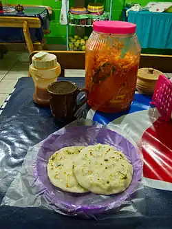 Pupusas and "chicharron con yuca" (pork skin & yucca) are very popular dishes originated in El Salvador. A Pupusas is a corn meal (masa) patty stuffed with meat, cheese, or vegetables and topped with a pickled mix of spiced shredded cabbage known as curtido.