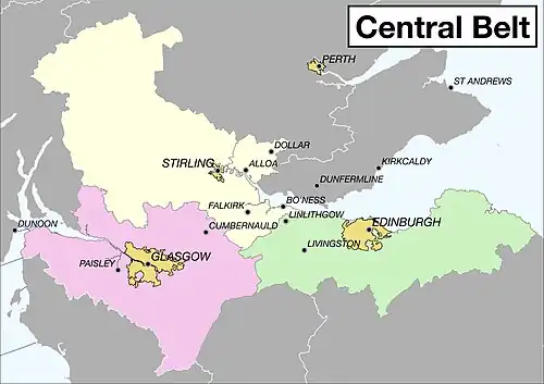 The Central Belt of Scotland is the broad lowland strip between the Firth of Forth in the east and the Firth of Clyde in the west. It includes Edinburgh and Glasgow the two principal cities, and a string of other large towns: most of the Scottish population live here. It's bounded to the north by the Highlands and to the south by the Southern Uplands. Geographically it includes Fife north of the Firth of Forth, but on these pages that's described as part of North East Scotland.