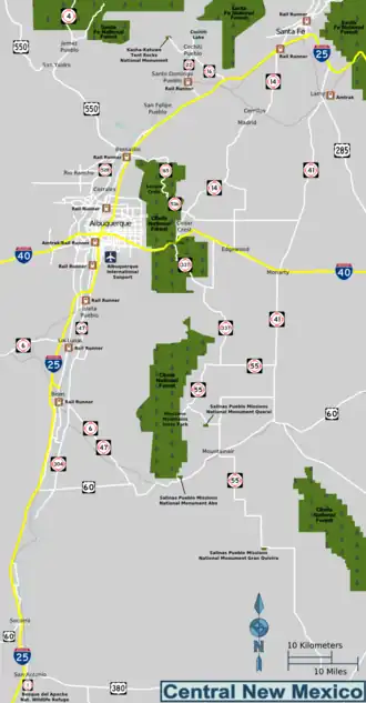 Central New Mexico is the region of the state containing Albuquerque and vicinity. Unusually for a United States city of significant size, Albuquerque has almost no true "suburbs" that have grown along with and after, rather than independent of, the city; about the only one of consequence is Rio Rancho. Several Native American pueblos also call this region home, some of them of interest to the traveler. Attractions in Albuquerque are covered in that city's guide; this page deals with attractions of the extended region. Santa Fe, the state capital, is generally considered part of the North Central New Mexico region.