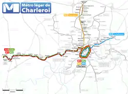 Métro léger de Charleroi, which translates as "light metro of Charleroi", is a light rail system that is a combination of underground rail and street-level tram/light rail, which is often referred to as a "pre-metro". In the city centre, it travels underground over a loop line, while going into the suburbs it becomes a ground-level light rail with separate right-of-ways or a street-level tram using the tracks of Belgium's former vicinal system.