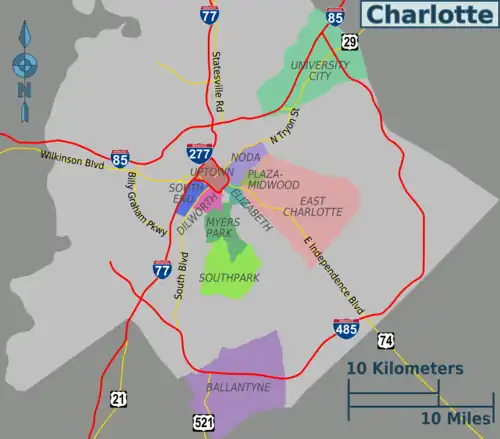 If you are not driving or renting a car during your visit, try to find lodging near the center city (these can be found in the district articles). Otherwise you will be stuck paying cab and bus fares, and you will find it quite difficult to move around as freely as you'd like. Most of the city's large hotels are either uptown, near the airport, or in the University area. There are also some luxury hotels appearing in Ballantyne, and there are the typical options off the highways and interstate exits.