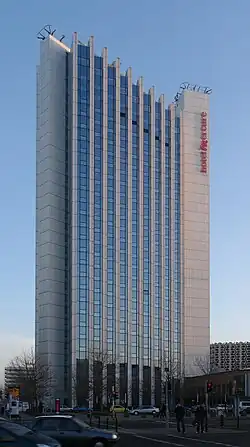- 🌍 Dorint Kongresshotel Chemnitz (Mercure Kongresshotel), Brueckenstraße 19, 09111 Chemnitz, ☏ +49 371-6830, info.chemnitz@dorint.com. This hotel is the large landmark "radiator" building found in the centre of Chemnitz. With 386 rooms, it's one of the largest hotels in the area. The rooms are equipped with modern amenities. Parking can be found nearby and the main railway station is within five minutes' walk. Facilities include a restaurant, bar, WiFi and currency exchange. Reception staff speak English and German. Pets are accepted and there are some smoking rooms. €59-89 per night.