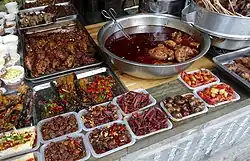 Steamed buns(包子; baozi).Sold for breakfast or lunch from street vendors throughout the city. Yagcai bao (芽菜包) is a local Sichuan special variety you are unlikely to find elsewhere and typically contains some mixture of Yacai (芽菜), a type of preserved vegetable, and potentially some meat. Other typical fillings include beef, red bean paste, mushrooms, green vegetables or pork. Three buns cost around ¥1 or larger buns cost ¥1 each as well. A container of soy milk (豆浆 dou jiang) is about the same price.