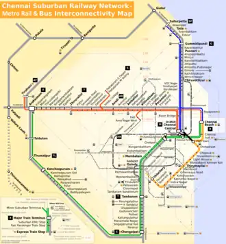 - 🌍 Tambaram SR (station code: TBM, தாம்பரம் Tāmparam), Railway Station Road, Tambaram East (SW 29 km from Chennai Central). Serves the suburban areas of Chennai. Trains to Chennai Beach (every 5-10 min), Chengalapettu (every 10-15 min) and Kanchipuram (half hourly or so).