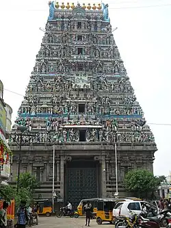 - 🌍 Kapaleeshwarar Temple (கபாலீசுவரர் கோயில் Kapalīsuvarar Kōyil), 12, North Mada Street, Mylapore (Thirumayilai MRTS ). 6AM-1PM, 3PM-8PM. One of Chennai's oldest and best-known temples, is said to date to the 8th century, although the present structure dates to the 1600s. Notable above all for its soaring, incredibly detailed 37m gopuram (entrance gate). There is a large water tank behind the temple, used for the Thaipusam festival (Jan–Feb), and plenty of flower shops all around and the famous street markets of Mylapore selling Indian handicrafts and brass vessels. Within easy striking distance of the city centre. This temple is for Goddess Karpagambal or 'Goddess of the Wish-Yielding Tree'. The goddess is one of the forms of Parvati, Lord Shiva's wife. Nearby the temple, there are pharmacy shops selling traditional Indian medicines of Ayurveda and Siddha.