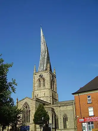 - 🌍 St Mary's and All Saints Church (The Crooked Spire), Church Way S40 1XJ, ☏ +44 1246 206506. M-Sa 10AM-4PM. You couldn't build it deliberately if you tried: the famous spire was added in 1362 but is only described as "leaning" from the 18th century. It's primarily a rotation of 45°, plus a lean that takes its tip 9½ feet off-centre. Probably this arose by a combination of green timber shrinking, extra roof weight, lack of cross-bracing, and rot: subsidence isn't a factor as the church below stands true. The church is Anglican and the interior is mostly Victorian. There are guided tours of the tower most days April-Dec. Free; spire tour £10 adult, £5 child.