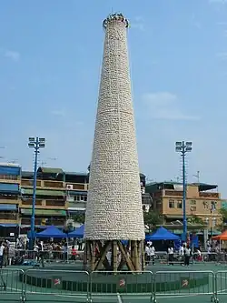 The Cheung Chau Bun Festival.Is a popular annual event held in early May, this is a festival where people climb up a tower which is covered with buns. Previously it had been abolished because a tower collapsed and injured 24 people in 1978 under immense weight by people climbing onto it. However, thanks to the people who live in Cheung Chau, who campaigned for many years, the government allowed this component of the festival to restart in 2005. It is now turned into a climbing competition with heats and finals for men, women and team categories. A bun tower being prepared for the festival.The Bun festival lasts for five days and the climax is on the third day when participants dress up as historical characters and ride on floats. When children act on the floats, they appear in the air because of their dress. On the last day, at midnight, buns from the tower will be given to the community, bringing them good luck throughout the year. People believe that the more they get, the luckier they are. Ferries are very crowded on the day though, so expect long queues if you intend to go.