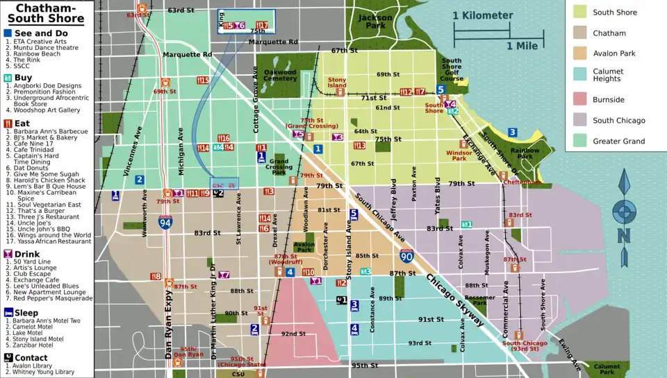 South Shore is home to a lively arts scene, largely thanks to the ETA Creative Arts Foundation and the magnificent South Shore Cultural Center. It is also home to one of the city's best and least known beaches, Rainbow Beach. Incidentally, many of Chicago's most prominent black politicians call this community home. Its main commercial strip runs alongside Metra's Electric Line on 71st St and is literally lined with kids hanging out when school's not in session.