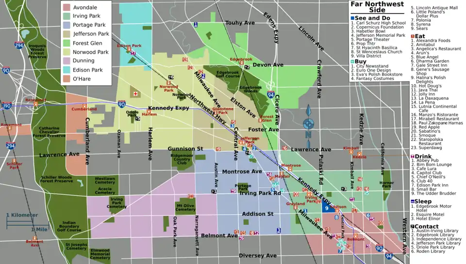 The Far Northwest Side of Chicago includes the neighborhoods of Avondale and the Polish Village (Jackowo and WacΕawowo), with large Polish communities; Irving Park and Old Irving, quiet areas with historic homes; and Forest Glen, Jefferson Park, Norwood Park, Edison Park, Edgebrook, Dunning, and Portage Park, residential areas which have nice parks, old theaters, and some big annual festivals.