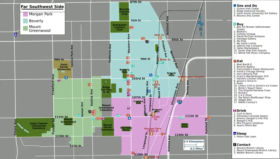 Beverly is the most distinctive of the Far Southwest neighborhoods and probably has the most to offer travelers. Here you will find Givens Castle, the Ridge Historical Society of Beverly and Morgan Park, and plenty of Irish pubs. You might want to visit just for a change in topography β Beverly is the only neighborhood in Chicago with hills, lending it the odd-sounding nickname Beverly Hills. Along with Morgan Park to the south, Beverly is one of Chicago's few racially integrated neighborhoods, with a sizable African-American minority living side-by-side with the neighborhood's large Irish-American community.