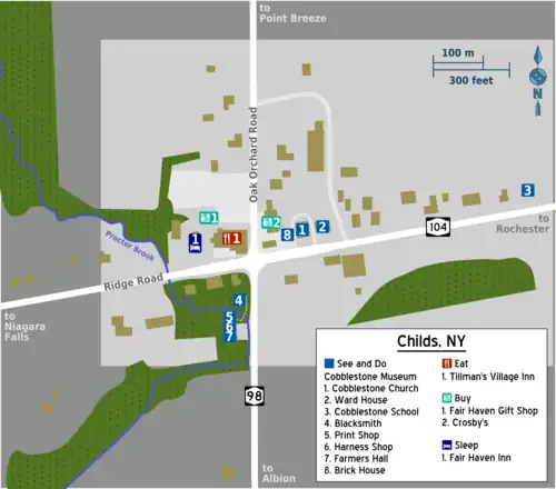 - 🌍 Fair Haven Inn, 14369 Ridge Rd, Albion (adjacent to Village Inn), ☏ +1 585 589-9151. Check-in: 2PM, check-out: 11AM. This is the only lodging in Childs. The Tillman family opened it several years ago in an 1837 Greek Revival house. The house has four bedrooms, and there are four more "Creekside" bedrooms in a nearby building. The rooms in the house have a more antiquated feel, while the Creekside rooms are more modern and more spacious. Each room has two double beds and a private bath. No smoking or pets. $80, with meal packages available that provide discounts at the Village Inn.