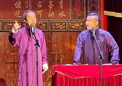 Xiangsheng (相声 xiàngshēng), also known as crosstalk, is a uniquely Chinese form of comedy. In its simplest form, it involves two performers having a dialogue in Mandarin with a strong Beijing accent, using exaggerated facial expressions and body language, wordplay and banter for comic effect. More elaborate forms can include singing, rapping and even musical accompaniment.