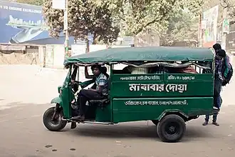 Auto rickshaws (also called CNG taxi, or simply CNG) are good for shorter trips. Always in a distinctive green livery, auto rickshaws are three-wheeled partially enclosed contraptions that run on CNG and can seat three-four people in the back. In general, they are much cheaper than taxis and can be hailed from the street easily.