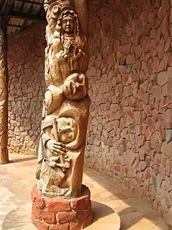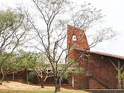 - Marian sanctuary (Santuario Mariano de la Torre Virgen de la Asunta) (A couple of kilometres northwest of the town. There leads a very good quality stone-paved road (which has a full-length sidewalk) - an unusual sight for Bolivia. Ask locals, how to find the road). Designed by Hans Roth (the architect who restored the churches of the Jesuit Missions of the Chiquitos), built from red bricks (adobe), split stones and wooden columns. The setting (at the feet of "Devil's Thumb"), the modern design and the color of the sanctuary makes an unforgettable impression, enhanced further by a multitude of wood-carved fine-detailed columns, doors and decorations, making the Sanctuary an amazing artwork. Inside, the roof is supported by Arbol de la Vida (the Tree of Life) - the giant tree-like wood-carved column. The columns and other woodwork tell the story of suffering - there was a volcano eruption there killing a lot of people; some people escaped by Red Oriental train after the train crossed the fragile bridge and the following lava burned the bridge to the ground, but did not advance further. The sanctuary was built to remember the tragedy and to worship Virgin Mary as a people's savior. The hike to the Sanctuary is an experience in itself - meanders in serpentines and offers good views to Serranía Santiago mountains, "Devil's Thumb", Red Oriental railway.