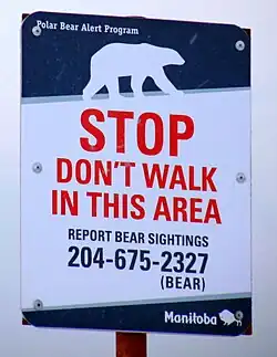 Cold weather is theoretically a danger, but you probably won't have an opportunity to get hypothermia, since most all excursions in the winter will involve a vehicle and a fair degree of supervision. Polar bears are a real danger, though. Be careful when walking anywhere on the outskirts of town, such as Cape Merry, by the inukshuk and the big wooden boat behind the town centre, or anywhere outside of town. In such areas close to town you will notice Polar Bear Alert signs "Stop. Don't walk in this area", and if you do see a bear in or near town, call the Bear Patrol immediately at +1 204-675-BEAR (2327).