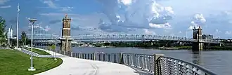 Roebling Suspension Bridge from Smale Park - π John A. Roebling Suspension Bridge (Riverfront). The John A. Roebling Suspension Bridge was the longest suspension bridge in the world at 1,057 feet (322 m) when the first pedestrians crossed on December 1, 1866 β a status it maintained until 1883. You can still walk across it today and tour the Riverside Drive historic district - one of the oldest neighborhoods in the region in Covington It served as the prototype for Roebling's design of the Brooklyn Bridge in New York. This bridge was featured in the movie Rain Man.