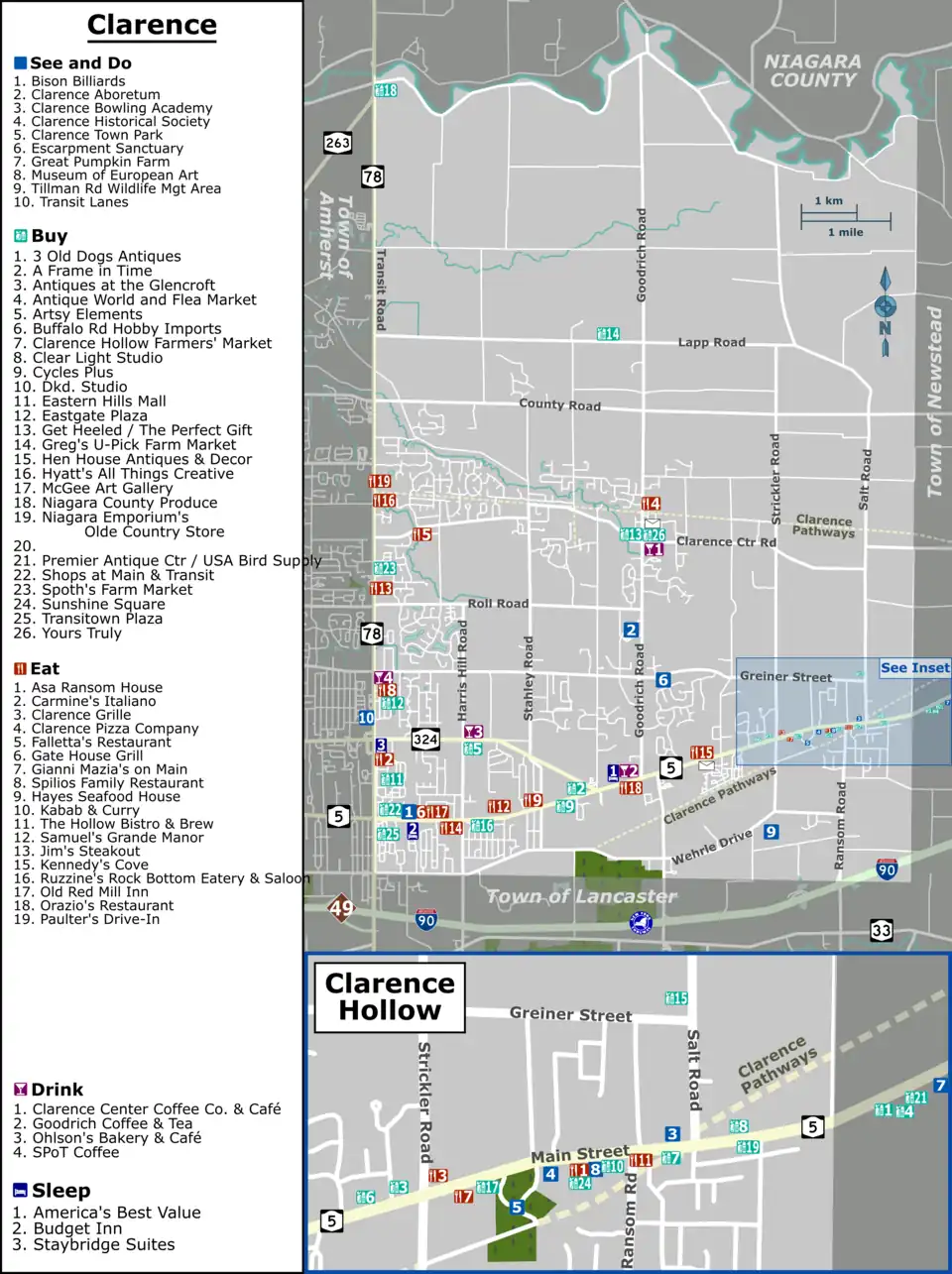 By car, Clarence can be accessed most easily by Exit 49 of the New York State Thruway (I-90). After exiting the highway, turn left on NY 78 (Transit Road) and proceed north to NY 5 (Main Street), then turn right. Clarence Hollow—the focus of most of the town's attractions—is along Main Street about 5½ miles (9 km) east of Transit Road.