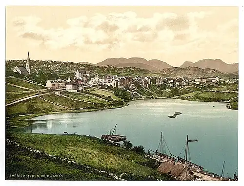 Clifden (An ClochΓ‘n, "stepping stones") is a small town on the northwest coast of County Galway in the west of Ireland. It grew up as a harbour and market town, then after the Famine became a coast resort with its present Victorian architecture. Clifden's population in 2022 was only 1250, but this greatly swells in summer, as it's the main commercial and tourist centre for Connemara.