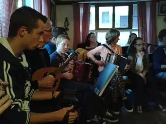 - Tinteán Ceoil is community trad music, sing-song and story-telling in the style of bothántaíocht - gathering in someone's kitchen rather than the pub, so women and youngsters could fully participate. It's year-round on Monday 19:30-21:30, adult €5. In summer it's also on Thursday evening. The sessions are in Halla Le Chéile, Brandon V92 DK4C.