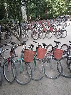 The distance from the entrance to the main pyramid is over 2 km. Bicycles are available for rent for M$80 (September 2025), and bicycle rickshaws and drivers are available to take you throughout the site; using one or the other is a good idea. Note that tall visitors may have difficulty finding a bicycle of suitable height. Bicycles are not allowed onto the ruins themselves, so walking a short distance at each group of buildings is inevitable.