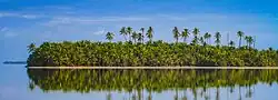 Flat, low-lying coral atolls, thickly covered with coconut palms and other vegetation.