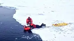 Getting drenched at freezing temperatures, for example falling into frigid water, is an emergency. Without a change of clothes or going inside into a warm room, hypothermia quickly sets in. In cold water, useful movement is possible up to 10 minutes and survival up to 30 minutes. However, the immediate cold shock response can make one inhale water or even cause a heart attack. When saved from the water, the victim must get dry clothes with no delay (and may need warm shelter and possibly immediate medical care).