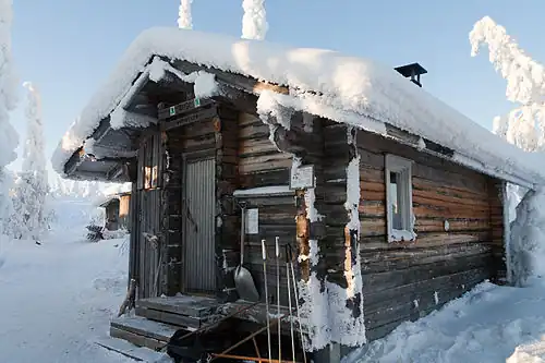 Open wilderness hut in Finnish Lapland. Spartan, but shelter against the elements and a stove for heat.