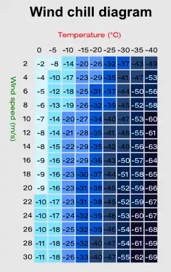 Cold weather is much less dangerous when not combined with wetness or wind. Moist air will feel much colder than dry air at the same temperature, and wind will increase the cooling effect and thereby the frostbite risk.