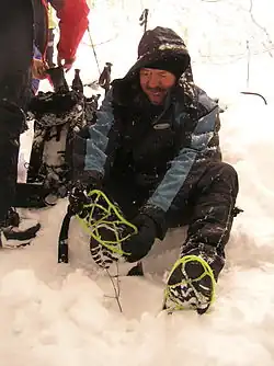 Frostbite means damage caused to skin and other tissues due to freezing. Although the mechanism is different, the effect resembles burns, and like sunburn, the condition might not get noticed until too late. This is especially true during physical activity such as trekking, or in windy weather. In theory, cooling the skin is painful, but cooling also lessens sensation. It is easy to ignore the beginnings of numbness, and then damage can occur unnoticed. Therefore awareness and active checking are needed. Watch out for white spots on your fellows' skin. The nose, ears, chin and cheek are the body parts most easily affected, especially in windy weather. Fingers and toes may also get frostbitten, but you will more easily notice them getting uncomfortable. However, when exercising in an already adrenaline-packed situation such as mountaineering, it is easy to ignore the numbness or pain, particularly in toes. Frostbite, if left unchecked in such a situation, leads to permanent damage and even amputation in a similar manner as third-degree burns. Active checking is necessary, and wiggling fingers and toes will help keeping them warm. Fingers can be placed in armpits to warm them. Children will often fail to report that their fingers are cold or damp; active checking by an adult is necessary.