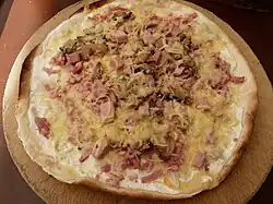 Tarte flambée (Flammekueche in Alsatian, or Flammkuchen in German) is the Alsatian equivalent of pizza, though extremely different. Traditionally, it is made of a thin layer of dough, covered with crème fraîche (rich sour cream), cheese, onions, and bacon (lardons in French). It is baked very quickly in an extremely hot oven so that it gets crispy. Legend has it that the dish was a solution to the extra scraps of dough left over from the bakers. Other regional specialties include the Black Forest cake (with raspberry, cream and sponge) and quiche Lorraine.