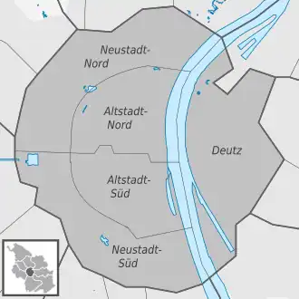 The part of Innenstadt lying on the outer side of the ring is the Neustadt, or "new town". Neustadt is further divided into Neustadt-Nord and Neustadt-Sued, also separated by L111 (Aachener Straße). Both parts of the Neustadt form a crescent embracing the Altstadt and reaching the Rhine on either side thereof. Finally, facing the Altstadt and Neustadt on the other (eastern) side of the Rhine is the Stadtteil of Deutz, which completes the Innenstadt.