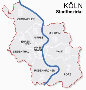 Cologne is divided into 9 districts (Stadtbezirke), numbered from 1 to 9. Stadtbezirk 1, called Innenstadt ("inner city"), is probably the one most tourists will spend all of their time in, as it contains most of the city's points of interest. It is also the only district that lies on both sides of the Rhine, as it includes Deutz. Districts 2, 3, 4, 5 and 6 are on the western bank of the Rhine, and districts 7, 8 and 9 on the eastern bank, surrounding the Innenstadt.