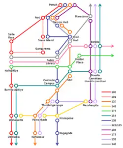 Colombo has an extensive network of buses going around the city/region. Bus stops have no timetable or route map as such. Fares depend on the type of bus and distance. Fares are only for the trip on bus that you are riding. Prices start at Rs 30 (as of 2024), buy from onboard conductor. The Ceylonlanka.info and Routemaster websites have partial, incomplete information on routes. Google Maps navigation via public transport works well.
