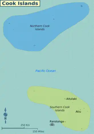 The Cook Islands is an island country in free association with New Zealand, located in Polynesia, in the middle of the South Pacific Ocean. It is an archipelago of 15 islands spread over 2.2 million km2 of ocean.