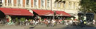 - 🌍 Dag H, Dag Hammarskjölds Alle 36, ☏ +45 35 27 63 00. M-W 08:00-23:00, Th-Sa 08:00-midnight, Su 10:00-midnight. Located on a small square, colloquially known as the little Triangle, this cafe is popular for its huge outdoor serving area, at the end of the lakes, it is a bit overpriced, but the coffee is top-notch and they have a decent collection of Danish and foreign beers. Brunch:125 kr, mains: 169 kr.