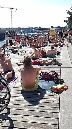 - 🌍 Docken, Færgehavnsvej 35, ☏ +45 39 29 92 00. Su-Th 11:00-23:00, F Sa 11:00-midnight. Early June to late August. With a huge outdoor area and an artificial beach, it is perfect for chilling on warm days. But they also house a restaurant, and the two large raw industrial storage buildings, houses exhibitions and concerts all summer long.