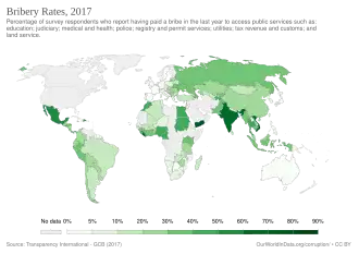 In some countries, and sometimes in certain specific regions, paying bribes is a necessity to receive various services from an official, or other person, in charge of a public or legal duty. Especially many developing countries suffer from corruption. Police in those countries may be poorly paid — many make less than US$50/month.