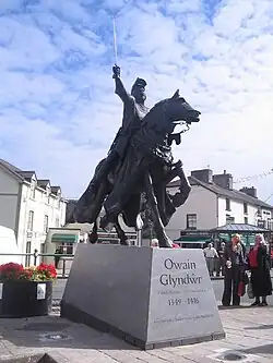 - π Owain GlyndΕ΅r statue. life-size bronze statue of the prince mounted on his battle horse