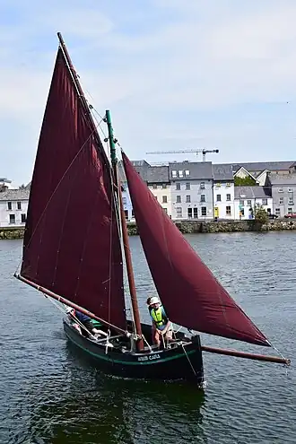 - The Galway Hooker (Húicéir na Gaillimhe) is a fishing boat traditional to this area; its larger classes also carried light cargo such as turf. It was launched off beaches into shallow water with oncoming Atlantic breakers, so it has a sharp entry, a "tumblehome" (the hull narrows rather than flares as it rises), and a single mast with one mainsail and two foresails. Its chief limitations are the lack of decking and the low "freeboard", so it's vulnerable to swamping, and you wouldn't risk an extended journey. It usually has a pitch-black hull with red-brown sails. Hookers are still made nowadays to traditional designs and are used as leisure craft like other small sailboats: for racing or for just larking about. There are courses if you'd like to learn how to crew or even build a Hooker.