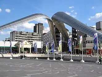 - 🌍 Whittle Arch, Millennium Place, Hales Street (adjacent to the transport museum). An impressive pair of arches spanning 60 m across Hales Street. They were built as part of a regeneration scheme in the area and named after the Coventry-born jet engine pioneer Sir Frank Whittle.