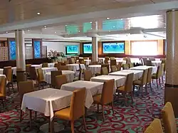 For details, each cruise-line explains its expected dress code on its website, and you can often find details on the nuances of policies on third-party web sites devoted to cruising. Most commonly, however, there's a casual dress code during the day, but dining for most evenings is more restrictive, typically "country club", "resort" or "smart casual": this is generally defined as collared shirt and slacks (or smart dark denim) for men, and either a dress or a blouse with trousers or a skirt for women. There's often one or two "formal" nights per week: tuxedo or dark suit and tie for men, evening wear for women. This policy applies to most cruise lines you could think of, including Carnival, Celebrity, Disney, Marella/TUI, MSC, Norwegian, P&O, Princess and Viking, with the differences between them usually being in terms of strictness – e.g. what P&O might require, MSC might simply "recommend".