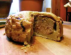 - Pork pie - a pie made of pork, with an outer crust made of a particularly crispy sort of pastry. Melton Mowbray in Leicestershire is their spiritual home but they are available across the country. They are served cold or at room temperature as part of a cold meal.