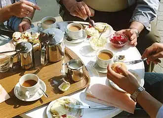 - Scones - Traditionally a speciality of Devon and Cornwall, though widely available throughout the UK in modern times, and an essential part of Devonshire and Cornish tea. Typically served with jam and clotted cream.