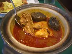• Ayam buah keluak is a distinctive dish combining chicken pieces with black nuts from the Pangium edule or kepayang tree to produce a rich sauce. The nuts contain hydrogen cyanide and are highly toxic to humans if not prepared correctly, making this dish very labour intensive to prepare. A speciality of Singapore and Malacca.