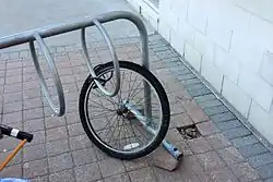 Bike thefts are common in many countries. Although locks cannot prevent theft entirely, they can discourage it. This is especially true if there are easier targets nearby, ideally posher than yours. A good lock is both hard to pick or decode, and hard to bypass with cutting tools or brute force. Fasten the lock in some stationary object when possible, and ideally through any quick release wheels as well. In some areas, bikes should not be left outdoors overnight.