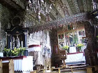 Dębno is world-famous for its spectacular medieval wooden church, one of the protected UNESCO World Heritage Sites. The church, dedicated to Archangel Michael, is first mentioned in chronicles from 1335 AD, but the original wooden church is known to have burned down; its present form was rebuilt in the early baroque. The structure was built entirely from wood, without metal nails or fasteners. The architecture and proportions are a great example of a wooden Gothic church, with some elements unique to the Podhale region. Interior walls are covered in Gothic polychrome decoration from around 1500 AD, and decorated with paintings that date as early as 15th century. The main altarpiece is an elaborate triptych from mid-16th century. The oldest piece in the church is a crucifix dated at around 1380, saved from the fire, and now seen hanging from the ceiling. (An even older piece, a late Romanesque painting from 1280, had since been moved to the Museum of the Archdiocese of Kraków.)